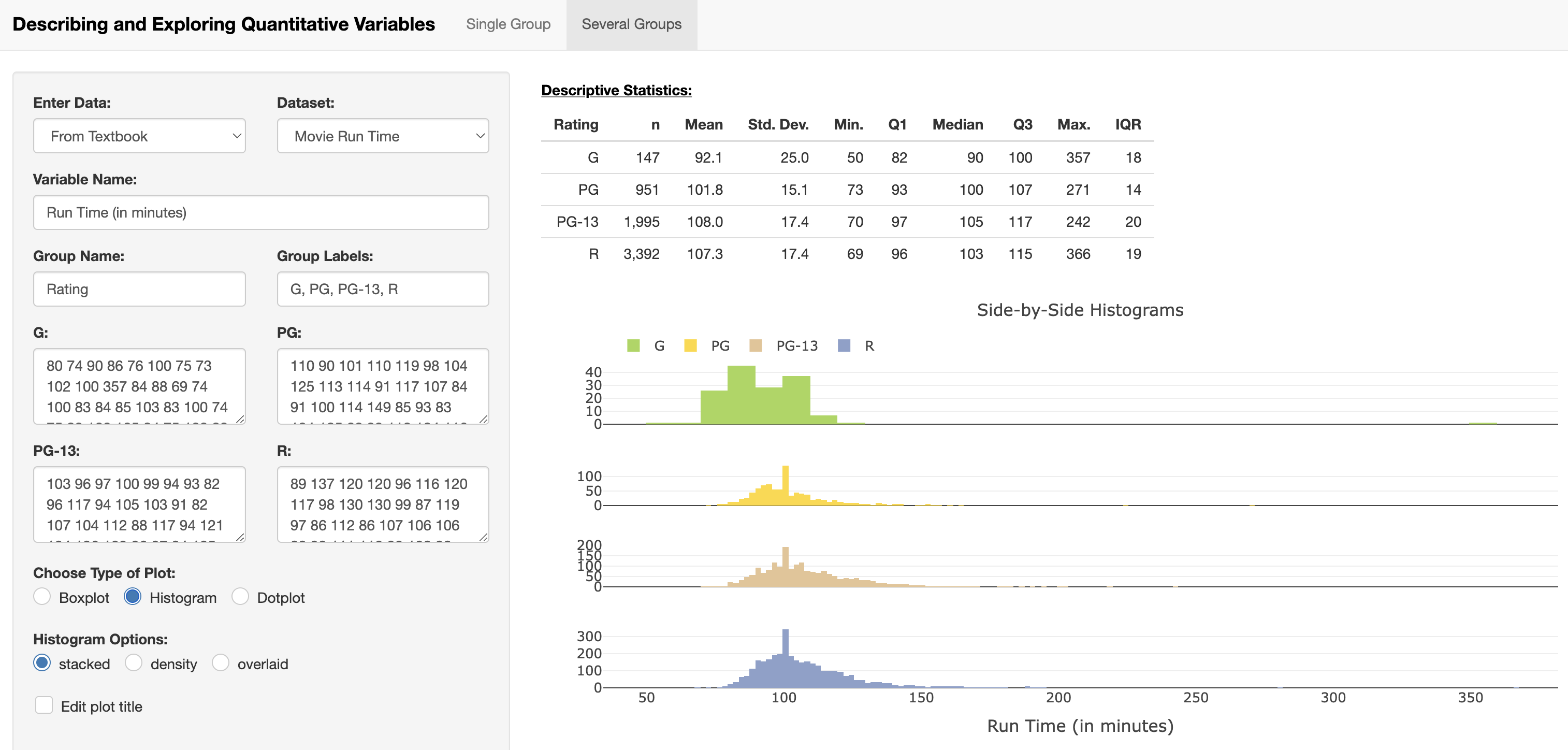 Now let’s explore the impact of extreme values, or outliers, on the variability of the G-rated movies. As determined in the previous questions, there is a single data point that is an outlier for this data set – the one G-rated movie that has a run time of 357 minutes!