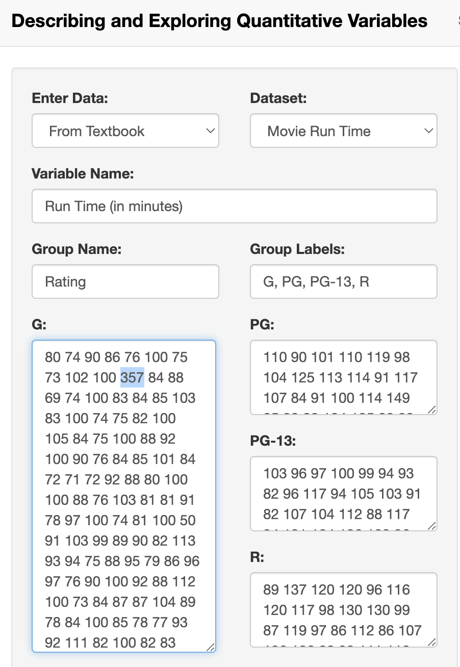 To remove the outlier from the statistical calculations and graphs, select and remove the point, [latex]357[/latex] from the list of G-rated movie run times. As illustrated in the following image, highlight the value [latex]357[/latex] and delete. The Descriptive Statistics section will automatically update based on your new data set that excludes the outlier.