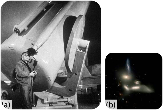 (a) Edwin Hubble used the 100-inch reflecting telescope at the Mount Wilson Observatory in California to show that some distant specks of light were galaxies. (b) Hubble’s namesake space telescope spotted this six galaxy group. Edwin Hubble demonstrated the existence of galaxies.