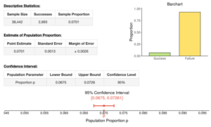 3. A friend reads the output and interprets the confidence interval as the  following:“There is a 95% chance that the population proportion of college students  who always wear sunscreen is between 0.0675 and 0.07261, or 6.75% and  7.261%.”