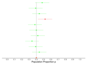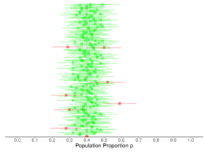 Hint: The green lines are those that actually did contain the population proportion— how many green lines are in the previous picture?