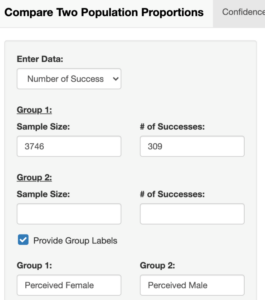 To enter the summary data at the beginning of this preview assignment, select “Number of Successes” under “Enter Data” on the left-hand side. Since we are interested in calculating the confidence interval for [latex]\hat{p_{F}} - \hat{p_{M}}[/latex], Group 1 is the group perceived as female and Group 2 is the group perceived as male.