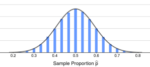 The following graphs are sampling distributions that show the proportion we would expect to choose bottled water in the sample if there was no preference in the population.