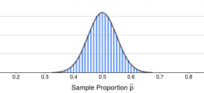 Since the normal distribution is being used to model the values of the sample proportion that would occur if the null hypothesis is true, we can check the condition by replacing [latex]p[/latex] with the value from the null hypothesis ([latex]p = 0.5[/latex] in the bottled water taste test example).