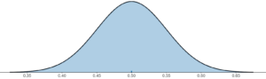 The following graph shows the null distribution for a sample size of 100 (standard error = 0.05). Note that the mean of the null distribution is 0.5—the value from the null hypothesis in the bottled water taste test.