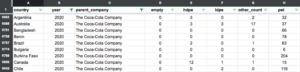 1 country year parent_company empty hdpe ldpe other_count pet
