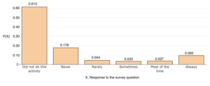 - A recent survey[1] conducted by the American College Health Association explored health-related behaviors of college students. One of the questions posed to the participants was, “Within the last 12 months, how often did you wear a helmet when you rode a bicycle?”The following table displays the responses to this question, as well as the probability of a surveyed college student responding with that choice.This graph is not a discrete probability distribution.Which of the following explains why this is not a discrete probability distribution?