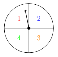 Suppose that we have a spinner with 4 sections, each of equal size, and the sections are labeled 1, 2, 3, and 4. Then the probability of the arrow landing in any one section on a spin is [latex]\frac{1}{4} =0.25[/latex]. Notice also that the outcomes of different spins are independent, so the multiplication rule for independent events applies here.