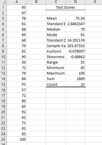 - Into cell D25, type =QUARTILE.INC(A1:A25,2)