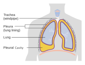 The pleura, shown in purple, surrounds the lungs.  The yellow space indicates the pleura cavity (size is exaggerated). ( https://commons.wikimedia.org/wiki/File:Diagram_showing_a_build_up_of_fluid_in_the_lining_of_the_lungs_(pleural_effusion)_CRUK_054.svg Image by Blausen Medical Communications, Inc. [CC BY 3.0 (http://creativecommons.org/licenses/by/3.0)]