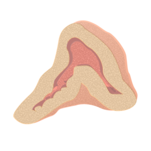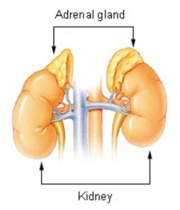 Figure 13.4The adrenal gland. The adrenal gland sits on top of the kidneys in the abdominal cavity. (https://commons.wikimedia.org/wiki/File:Illu_adrenal_gland.jpg By EEOC (cancer.gov) [Public domain], via Wikimedia Commons)