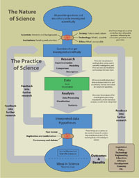 Scientific research methods are part of the practice through which questions can be addressed scientifically. These methods all produce data that are subject to analysis and interpretation and lead to ideas in science such as hypotheses, theories, and laws. Scientific ideas are developed and disseminated through the literature, where individuals and groups may debate the interpretations and significance of the results. Eventually, as multiple lines of evidence add weight to an idea, it becomes an integral part of the body of knowledge that exists in science and feeds back into the research process. Figure 5 provides a graphical overview of the materials we have developed to explain the real practice of science, and the key elements are described below.