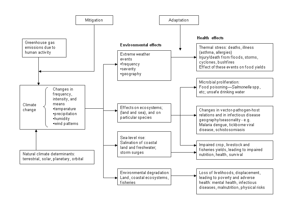 How Climate Change Affects Population Diagram summarizing the main pathways by which climate change affects population health. Source:Created by Cindy Klein-Banai, based on McMichael et al., 2006