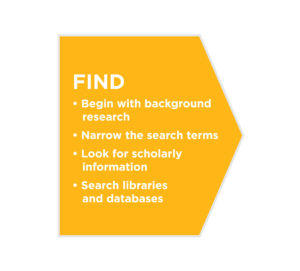Find sources: begin with background research, narrow the search terms, look for scholarly information, search libraries and databases.